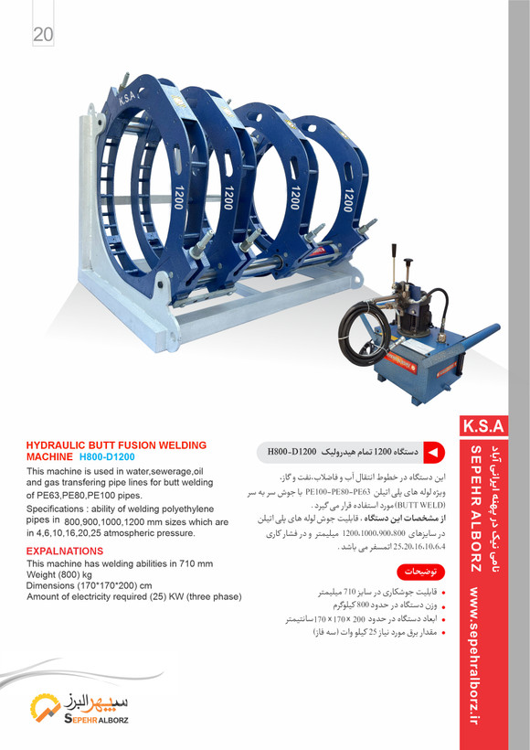 از مشخصات این دستگاه ، قابلیت جوش لوله های پلی اتیلن در سایزهای 800،900،1000،1200 میلیمتر و در فشار کاری 4،6،10،16،20،25 اتمسفر می باشد .